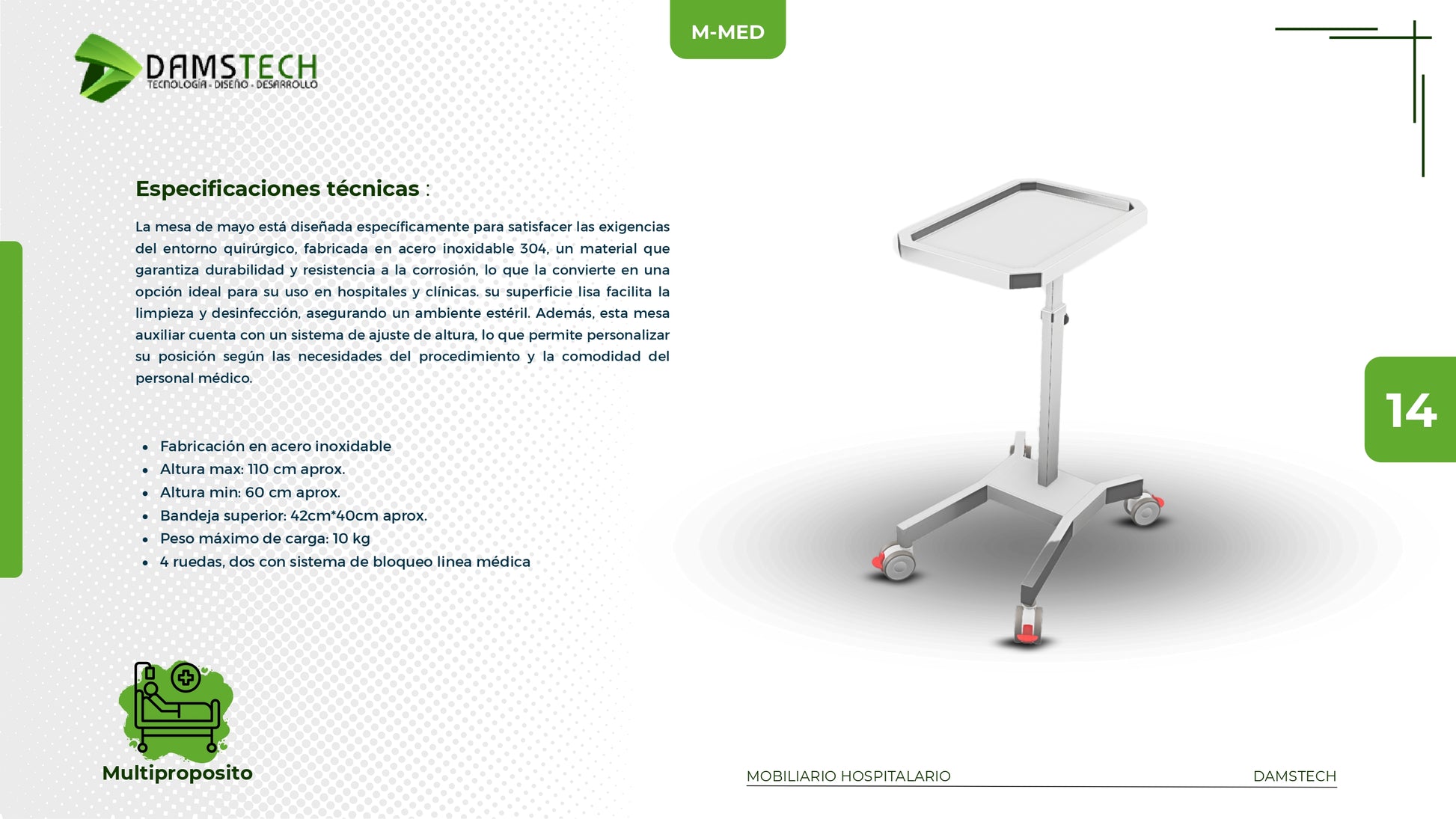 M-MED (Mesa de Mayo) — Mesa de mayo en acero inoxidable 304 con ajuste de altura. Superficie lisa y fácil de desinfectar.