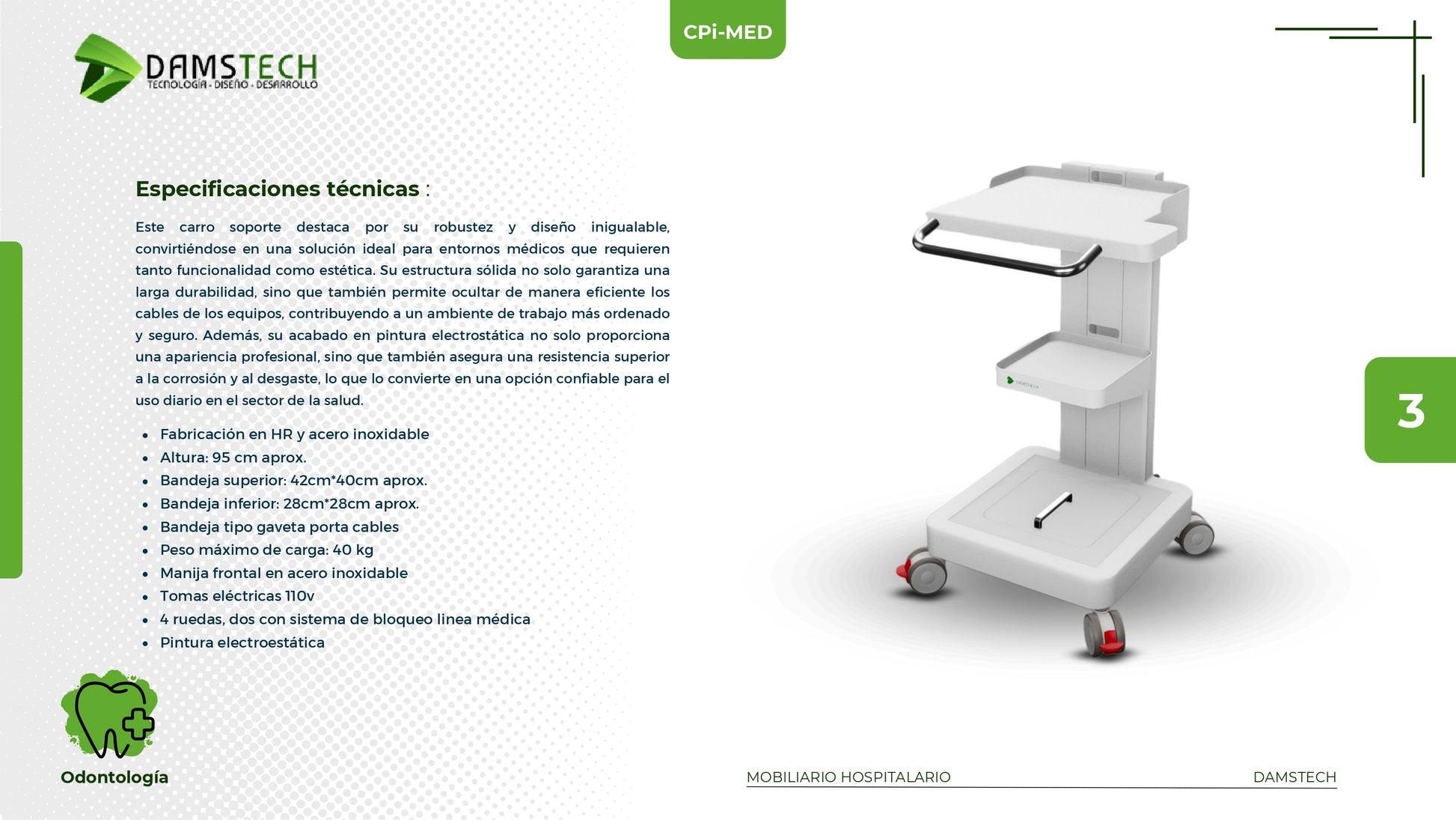 El Carro hospitalario CPI-MED es un soporte profesional diseñado específicamente para el uso de escáneres intraorales y equipos de diagnóstico portátil en consultorios odontológicos y médicos. Su diseño combina elegancia, funcionalidad y resistencia, ofreciendo al profesional de la salud una solución confiable para organizar y movilizar su equipo de trabajo.